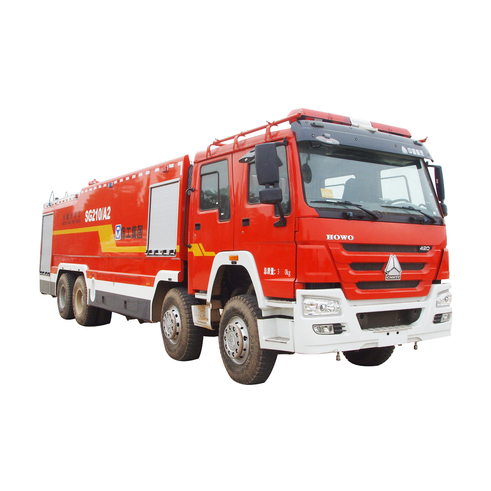 SG210A2水罐消防车采用重汽双排四开门型二类底盘;消防系统采用(希尔)HALE•RSD型消防泵以及成都威斯特公司生产的PSKD80型电控消防炮,装载的消防液可达21000kg,能够充分西部缺水地区的用户需求。